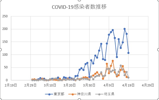 極小点をみると東京都はまだ増加傾向にあるが、神奈川県、埼玉県は落ち着きつつあるようにも見える。
